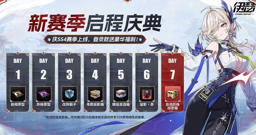 活动体系涵盖日常、限时与赛季专属三类。7日签到活动持续开放,每日登录即可获得升格原型、改异骰子等关键养成资源,连续签满7天可兑换自选跃格加密箱。另设赛季专属兑换码"ETHERIASS4",输入后可直接获取极相原型等限定道具,兑换截止时间为6月9日,请及时参与。