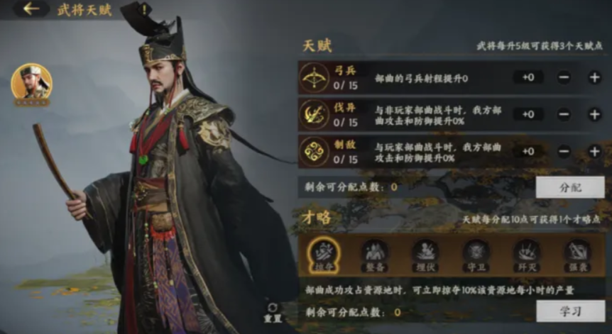 武将通过占领资源地获取经验提升等级,每次升级会获得固定数量的天赋点与才略点。两类资源独立存在,需分别投入“天赋”或“才略”界面。二者功能定位清晰:天赋专注战斗机制强化(如伤害增幅、减伤效果、控制触发率),才略则影响资源产出、行军速度等后勤维度。战力成型的关键在于天赋点的优先级规划,切忌平均分配。