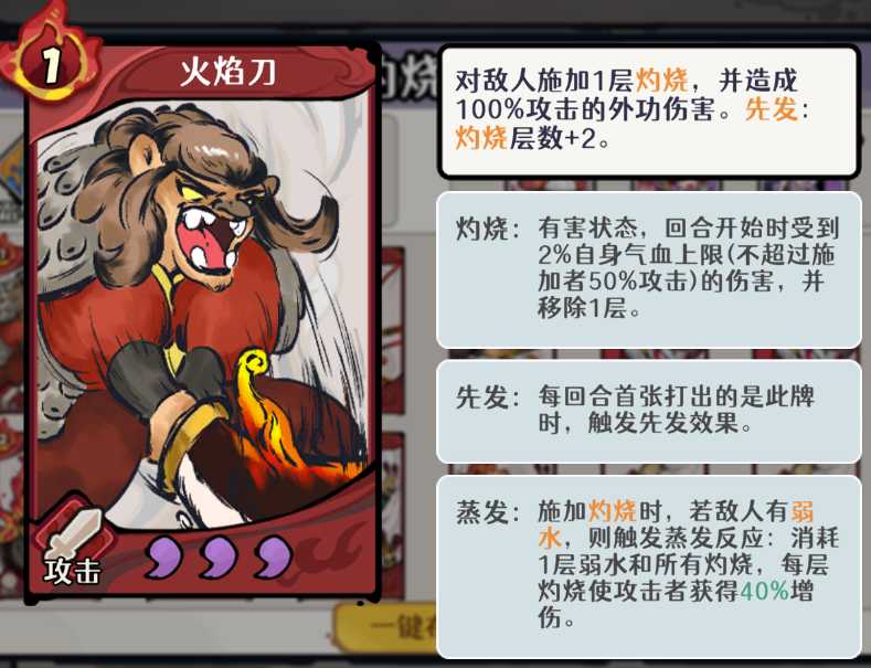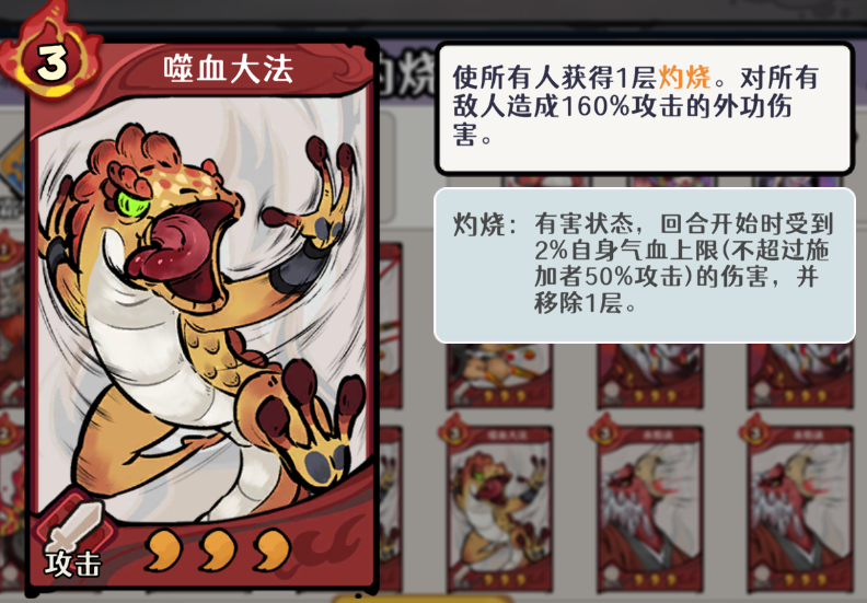 角色职责分工清晰:舞狮者定位灼烧型前排,其真气与专属技能均能稳定施加灼烧,同时具备一定的抗伤能力;弦音龙女作为功能型辅助,除提供群体增伤外,“发现灼烧牌”效果能显著提升关键卡牌的获取效率;噬血大法在本体系中有独特战术意义——其全体附加1层灼烧的特性,既可用于敌方叠层,也能主动为己方单位赋予灼烧状态,进而触发赤焰诀的减速联动,结合怒气管理达成“一怒双抽+七星拳补伤”的复合操作循环。
