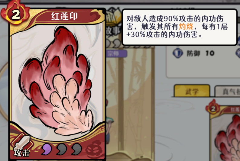 本流派以持续累积“灼烧”状态为核心逻辑,借助多轮施加、高频触发的模式实现滚雪球式伤害攀升。核心爆发技能为红尘灵狐的专属卡牌【红莲印】——该技能能无视敌方防御,完整结算当前所有灼烧层数,并转化为巨额内功伤害,灼烧层数越多,单次触发伤害越可观。因此,整体体系围绕“稳定叠层—高效抽滤—精准引爆”三个环节进行规划。