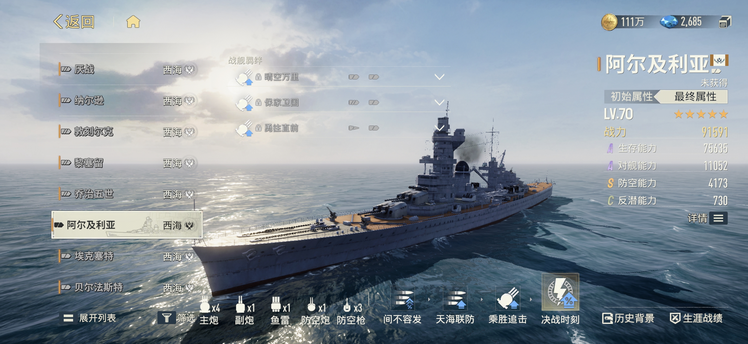 第二艘为阿尔及利亚重型巡洋舰,主打“动态火力增幅”系统。搭载大口径主炮与三层复合装甲结构,专为中后期拉锯战优化。进入决战阶段后,每间隔固定周期,主炮与副炮装填时间同步缩减,形成“越战越快、越打越密”的递进式火力网,大幅提升单位时间内的弹药倾泻密度。