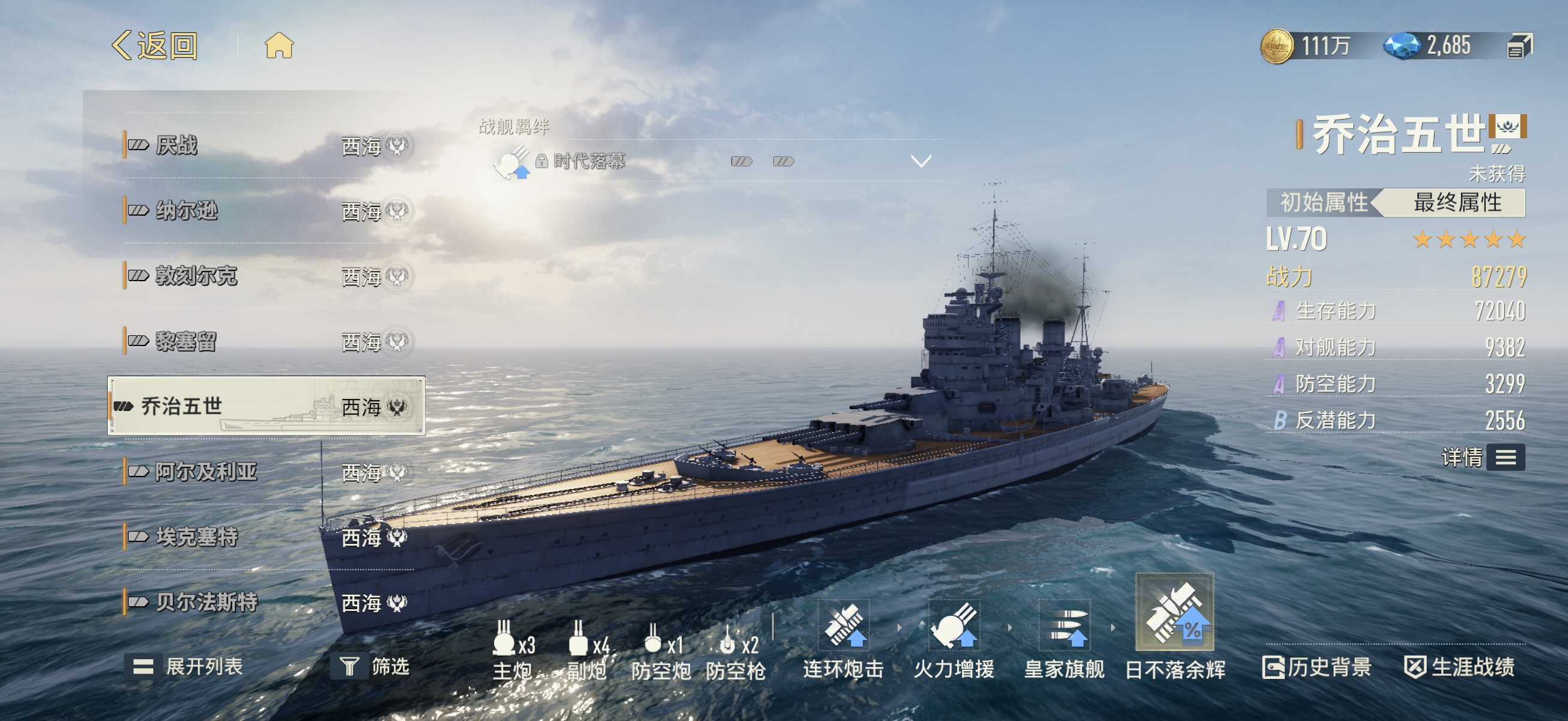 第三艘为乔治五世级战列舰,贯彻“小口径、高射速、强联动”的设计理念。虽单发穿甲伤害略低于同级巨舰,但凭借密集齐射频率与均衡防护能力,在目标锁定状态下具备极强压制力。当累计穿甲命中次数达到阈值后,主炮基础伤害获得显著提升,使其在针对单一高耐久目标时输出效率跃居前列。实战中推荐采用“贝尔法斯特起火→阿尔及利亚加速增压→乔治五世穿甲破防”的三段式协同链路,充分发挥阵营机制联动性。