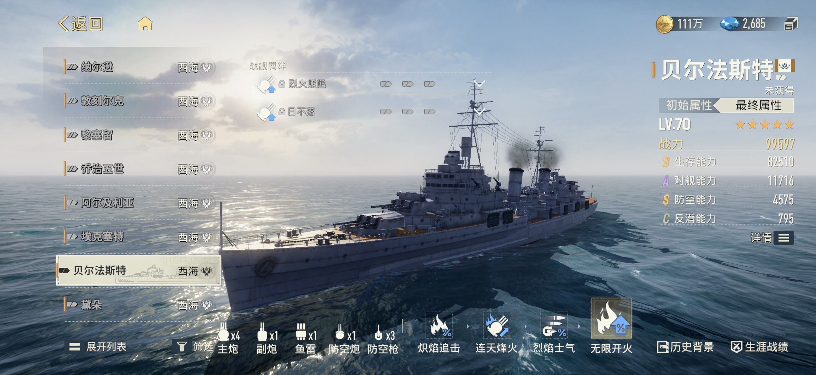 西海阵营目前拥有三艘标志性主力舰船,各自承担差异化的战术职能:首推贝尔法斯特轻巡洋舰,该舰突破传统分类边界——其装甲厚度达到重巡标准,航速与回转性能则贴近轻巡水平。其核心机制为“燃烧重置”:副炮命中触发燃烧状态后,主炮冷却时间立即归零,实现高频火力投送,是点燃战场节奏的关键节点。