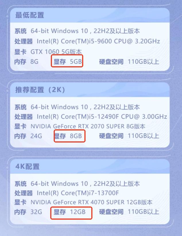 如需在4K分辨率下实现高帧率、高画质沉浸体验,建议配置GeForce RTX 4070 Super(12GB显存)。对于显存未达推荐标准的用户,可通过调整图形设置优化运行表现:优先将渲染分辨率设为1080P或更低,关闭各层级纹理质量、阴影精度与环境光遮蔽,尤其须禁用光线追踪功能——该模块对显存占用极高,是导致显存爆满的核心因素之一。