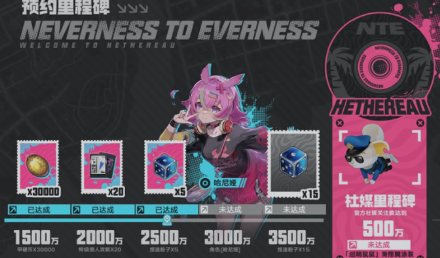预约人数达成特定关键节点将解锁额外奖励。当全渠道预约总量突破300万大关时,所有完成预约的用户均可获得限定角色“哈尼亚”——该角色为纯预约独占,不开放后续补领、商城直购或任何形式的付费获取途径。若预约总数进一步攀升至3500万里程碑时,还将追加发放15枚抽卡专用骰子,用于游戏中高稀有度角色与道具的抽取环节。