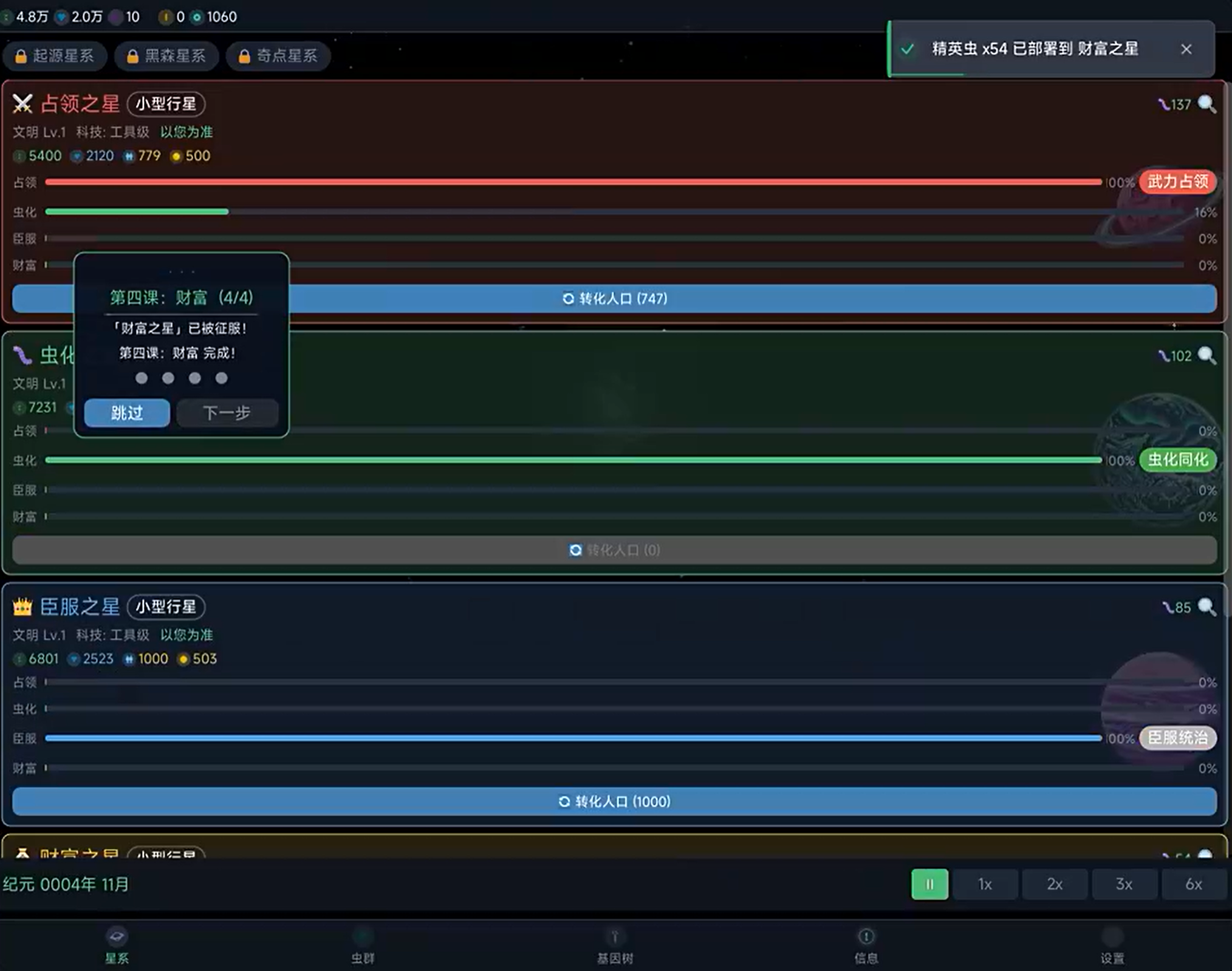 本作融合轻度策略框架与高随机性设计,每局对战的星系地图均具有独特性。玩家将化身虫群统御者,在差异化的星球环境中制定差异化征服路径——共设有占领、虫化、臣服、财富攻略四种核心策略模式,不同选择将导向迥异的发展分支与结局走向,显著增强单局重复可玩性与策略深度。