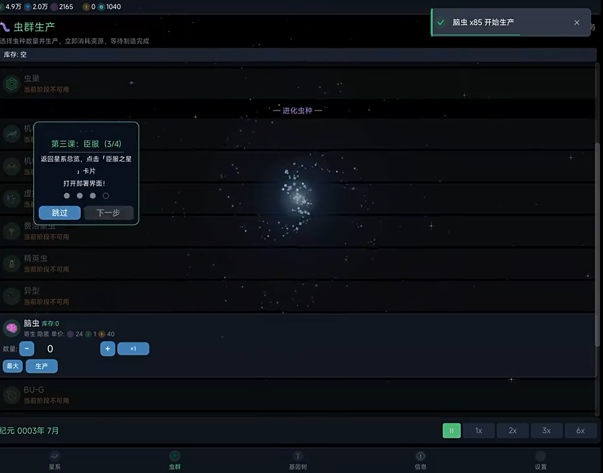 游戏核心围绕虫族生态培育与星域版图扩张展开:玩家可通过孵化、进化、基因强化等手段培育多样化虫族单位,逐步解锁高阶兵种与特殊能力;同时需统筹建设母巢基地,协调资源调配与科技树升级节奏。星系结构采用多层级架构,包含多个独立星域,各星域下辖行星在文明等级、科技成熟度及自然环境维度上均存在显著差异,形成丰富多元的战术适配场景。