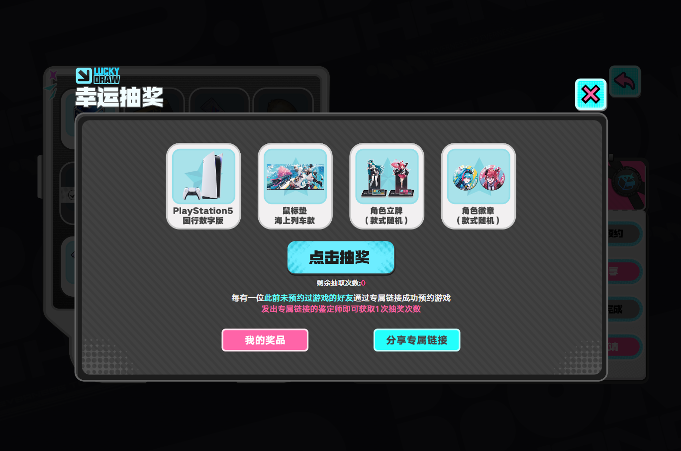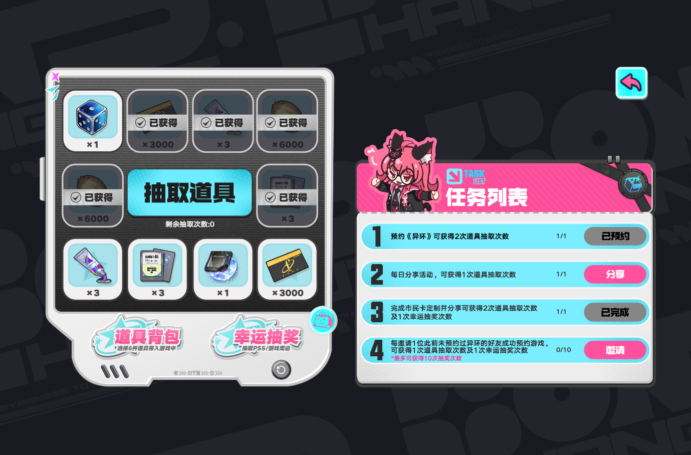 另外,活动还推出邀请奖励机制:每成功邀请一位未预约好友完成《异环》预约,不仅能获得道具抽取次数,还可额外获得一次幸运抽奖机会。该抽奖池包含实物奖品,涵盖PS5主机、定制鼠标垫、定制角色立牌、定制角色徽章等。所有活动参与及抽奖资格统计截止时间为4月22日23时59分,尚未参与的玩家请及时登录官网参与操作。