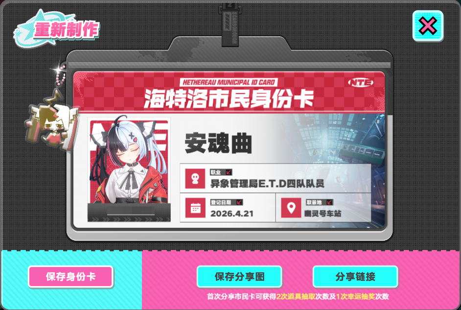 “异环海特洛定居指南”活动入口位于《异环》官方网站。活动包含两大核心板块:市民卡定制与道具集市。在市民卡定制环节,玩家能自由搭配头像、称号、职业标识、城市徽记等视觉元素,打造一张独具个人风格的虚拟市民身份卡,并支持一键分享至社交平台,留存为参与凭证。