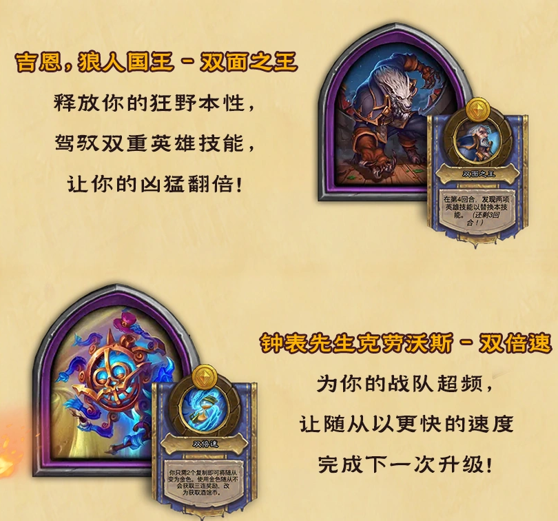 本季新增两位可选英雄:吉恩·狼人国王与钟表先生克劳沃斯。前者拥有双形态切换机制,从第4回合起可自由切换人形与狼人形态,两种形态对应不同英雄技能;后者技能聚焦于随从星级成长加速,可缩短升星所需回合数,助力玩家更早达成关键星级节点布局。