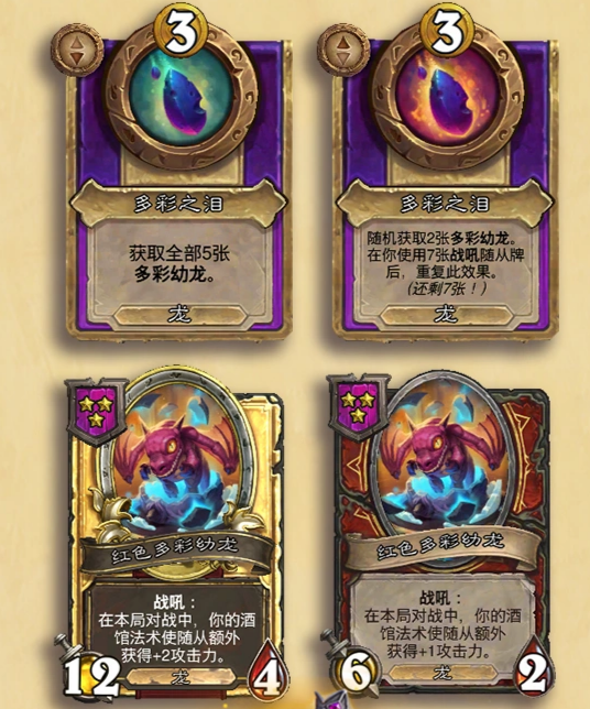 龙族体系同步升级,引入“多彩幼龙”关键词。每张多彩幼龙卡牌提供独特的增益效果,既可强化龙族随从的基础战力,亦能增强酒馆法术的生效强度与范围。该设定大幅拓展龙系构筑策略维度,玩家可根据当前对局形势灵活选取适配幼龙,构建高响应性、强适应性的龙族阵容。