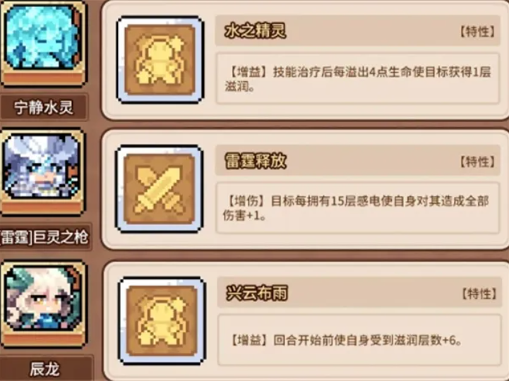 支援天赋的选择需依据角色职能精准匹配:宁静水灵绑定“水之精灵”,令其每次治疗溢出4点魔力时自动叠加1层滋润,形成治疗与增益的双重效果;若中排使用巨灵之枪,则推荐“雷霆释放”,为其提供15层初始感电并附加增伤,强化感电连锁反应;辰龙则适配“兴云布雨”,确保每回合开始即获得6层滋润,大幅缩短层数启动时间,加快阵容进入强势阶段的进程。