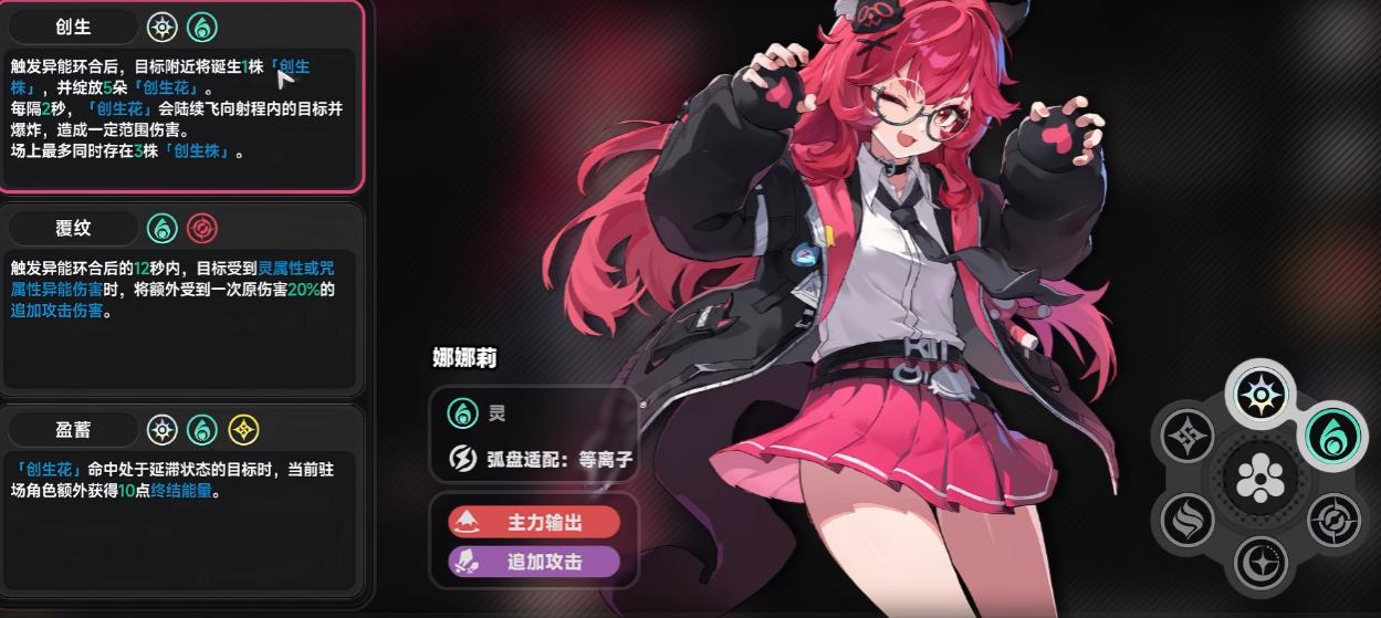 被动机制以“异能环合”为核心。灵属性特性使其与光、咒属性角色联动收益显著:与咒属性角色配合时,QTE触发后12秒内,敌人受到灵属性或咒属性伤害时,会额外承受20%倍率的追加伤害,适合长线持续压制;与光属性角色协同,则生成创生株及创生花,尽管单体伤害不高,但在清理小怪场景中表现稳定。另一核心被动在于:强化状态下,当队伍中任意角色触发异能环合时,娜娜莉会对单体目标追加一次普攻,有效提升多角色队伍的输出频率与总伤害。