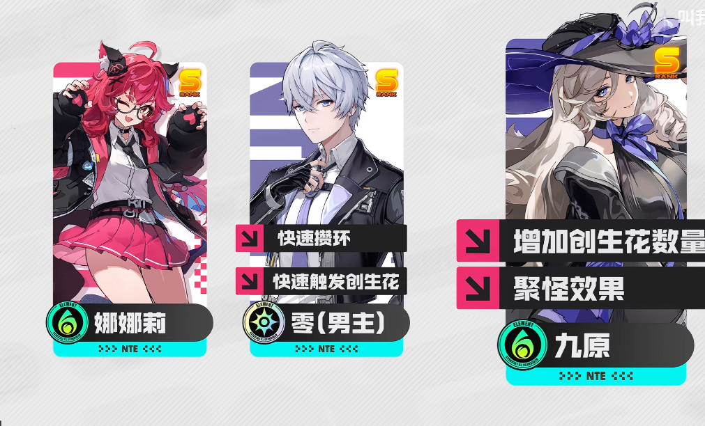 推荐的标准阵容配置为:主角+九原+早雾。主角作为全玩家拥有的基础角色,拥有稳定的技能衔接节奏与「会能」能量补充机制,能够在娜娜莉技能真空期维持创生花的生成节奏,确保输出的连贯性;其技能释放后能立即触发额外创生花,为首轮爆发奠定基础。