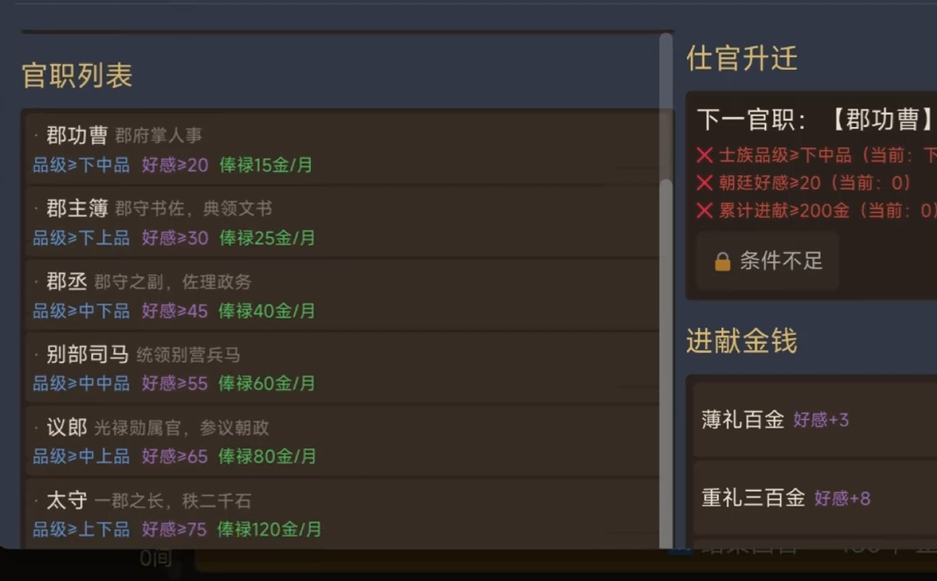 游戏开局需要选定初始家族,并以家主身份主导整体发展节奏。本作强调策略自主性——玩家既可专注内政建设,深耕农业产出与商业流通,打造富庶稳固的世家根基;亦可主动介入群雄纷争的局面,选择依附现有势力来积累声望,或独立募兵扩军、招贤纳士,逐步发展为割据一方的强势门阀。