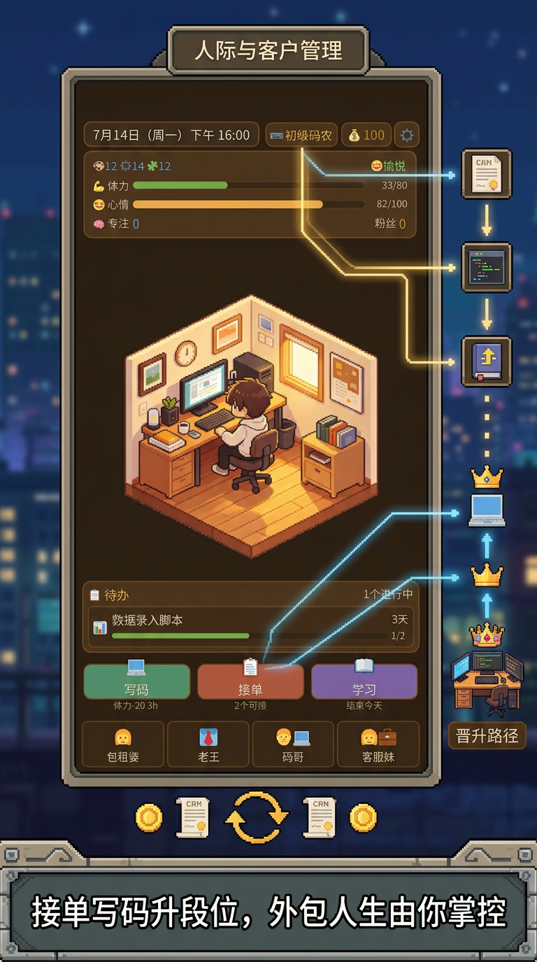 《外包人生》是一款以高度还原真实职场体验为核心玩法的模拟经营类手游,玩家将扮演一名刚踏入职场的外包自由职业者,在有限资源下开启职业成长之旅。游戏开局即置身于简朴的小出租屋,手握微薄启动资金与一台基础电脑,需通过接单、学习、规划作息等操作,逐步完成从生存到发展的蜕变。