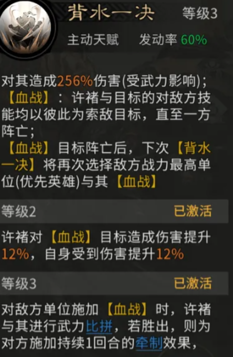 许褚的输出核心机制围绕“背水一决”展开——该天赋可对单名敌方目标造成256%的高额武力攻击伤害,且最终伤害值严格随自身武力属性线性提升。高武力基础配合此技能,极易实现关键目标的秒杀效果。与此同时,“背水一决”命中后会强制触发“血战”状态:许褚与指定敌方单位进入一对一锁定对战,双方所有技能仅能彼此交互,直至一方阵亡方可解除。若被锁定目标死亡,下一次“背水一决”将自动选取敌方当前战力最高者作为新血战目标,从而持续针对敌方核心战力。