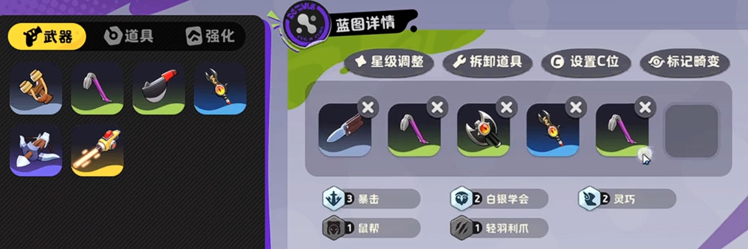 成型后的武器蓝图展现出显著的阶段性强度:前期凭借单件优质武器即可压制敌方血量,中后期多武器协同支撑持续输出,实现从开局到终局的全程压制。在资源分配上,建议优先锁定2星钢筋或小刀——因初始仅有2个武器栏位,先凑出2暴击更易过渡;后续刷出剪刀等关键装备时需立即装配,大幅提升弥克斯在战场中的近身清场效率。