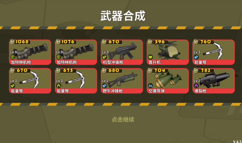 初始武器性能较为基础,但通过重复获取同类型装备进行合成强化,可实现属性倍增效果。完成特定关卡目标后,还能解锁高级武器,如喷火器、空袭导弹等特殊装备,大幅提升队伍战术多样性和火力覆盖范围。