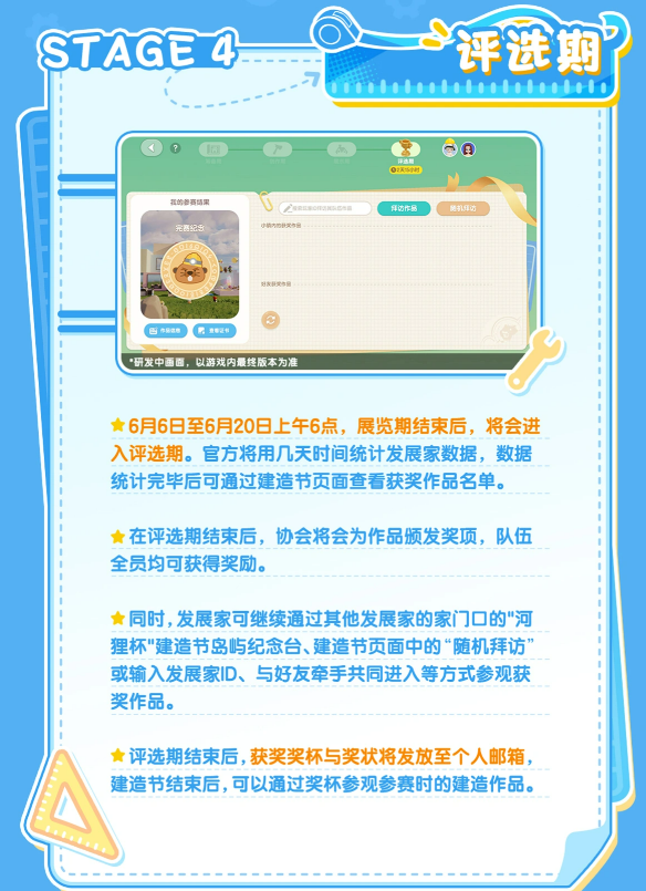 最终评选阶段为6月6日至6月20日上午6点。官方将根据数据统计结果进行综合评审,并于结束后统一公布获奖名单。所有参赛玩家均可获得基础奖励,优胜队伍还将额外获得专属荣誉奖项。奖杯与电子奖状将于评选期结束后发放至个人邮箱,且活动结束后仍可通过奖杯快捷回溯参观当时提交的完整作品,留存长久纪念。
