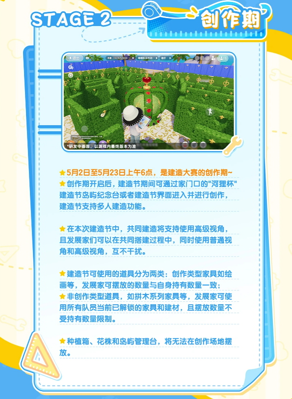 创作阶段自5月2日启动,持续至5月23日上午6点。玩家可通过家园门口的「河狸杯」建造节岛屿纪念台,或通过游戏内建造节专属页面,直接传送至专属建造岛屿进行搭建。本阶段支持多人实时协同建造,普通视角与高级视角可并行使用,互不干扰,有效提升团队协作效率与操作灵活性。