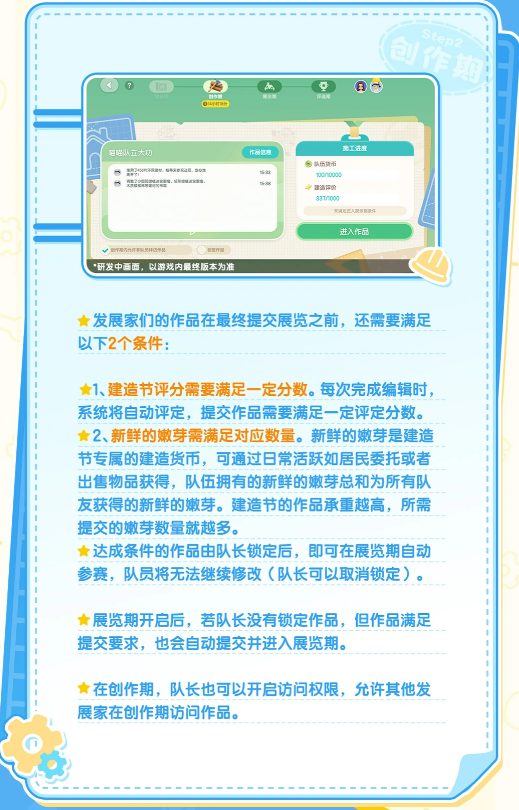 作品提交需同时满足两项基本要求:一是建造节系统评分须达指定基准线(每次保存编辑后将自动触发评分);二是队伍累计持有「新鲜的嫩芽」数量须达标。该货币仅在建造节活动中流通,可通过完成居民委托任务或出售物品获取。全队嫩芽数量为所有成员之和,因此招募活跃度高的队友能加快资源积累。值得注意的是,作品承重值越高、结构越庞大,所需嫩芽数量亦随之增加,建议提前规划储备。
