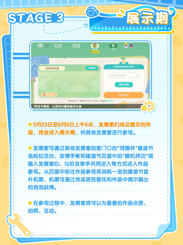 展示期为5月23日至6月6日上午6点。在此期间,全体玩家均可前往参观参赛作品。参观方式包括随机探访、输入发展家ID定向进入,或与好友携手同步入场,途径多样。通过游戏内页面直连需消耗「建造节直升机票」,该道具可通过完成居民委托任务获取,也可在参观时偶遇场景中随机刷新的泡泡拾取。观展期间支持点赞、截图及互动,欢迎为心仪作品投上支持一票。
