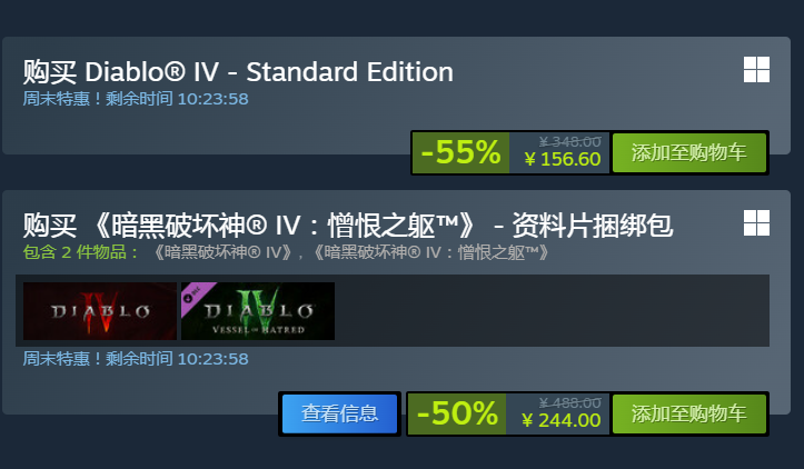 目前,《暗黑破坏神4》标准版在Steam上迎来4.5折优惠,折后价格为156.6元,刷新了该作上市以来的最低售价记录。若选择包含“憎恶之躯”DLC的组合包,则可享受5折优惠,总价为244元。对于想要完整体验剧情扩展内容的玩家而言,捆绑购买性价比更高。