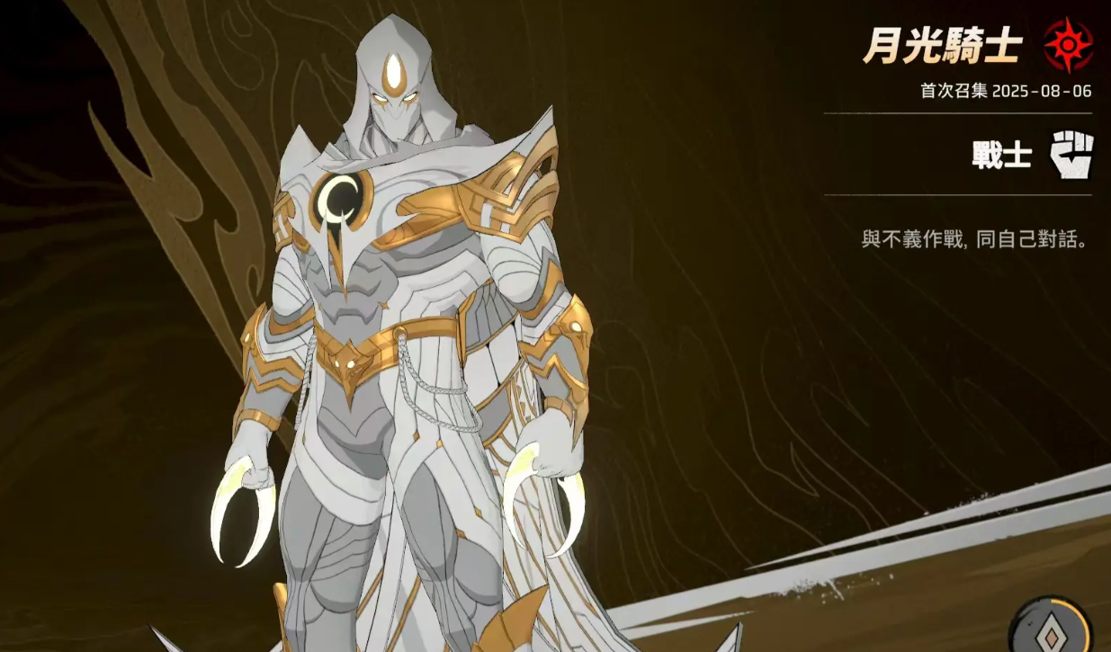 月光骑士是一名兼具群体加速与治疗功能的前排辅助,适用于多前排站位体系。被动技让他在战斗初始进入“新月”状态,一段时间后自动转为“满月”,此时技能消耗降低1点法力值;任意使用技能后将重置回“新月”状态。“夜游人”可瞬移至目标位置并对当前生命最低的敌人发起攻击,“孔苏之佑”则提升自身及周围友军的攻击速度。