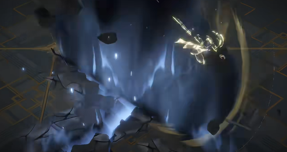 另一种强力技能是蓄力突刺:黑星会将武器置于身后进行蓄能,接着跃起猛击地面,引发爆炸气浪击退周围目标,同时触发大范围“光雨”从天而降。应对方法是在他跳跃的瞬间向后撤离,等到光雨开始落下时再迅速贴近,因为这个技能的落点是自中心向外逐层扩散,反而靠近中心区域更容易进入安全地带。