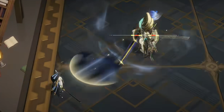 黑星的核心攻击方式包括长刃横扫,既能造成大范围近战伤害,还能释放远程剑气波。不仅如此,他会召唤出“影子分身”,模仿自身动作发动二次斩击,形成连招压制。每次挥刀完毕后,还会衔接一道月牙形弹道攻击,影子同样会复刻这一连招。因此,即便成功躲过第一波攻击,若忽略后续追击,仍有可能被击中。