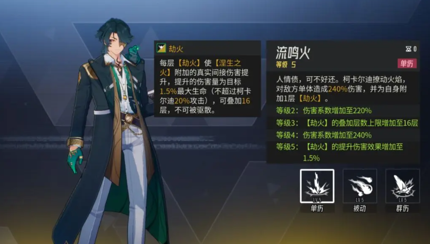 柯卡尔在海拉德银行担任首席经理一职,是剧情线中的核心角色,拥有显赫的权势背景。他的普通攻击名为流鸣火,可对单体目标造成火焰属性伤害,基础伤害倍率高达240%。此外,每次发动普通攻击时,他还会为自身叠加一层劫火状态。此状态关联其核心被动技能——涅生之火,每层可提升基于目标生命值1.5%的真实伤害(上限值不超过柯卡尔自身攻击力的20%),最高可叠加16层。需注意的是,该效果无法被敌方驱散,且只要场上存在己方角色,柯卡尔就不会成为敌方普通攻击的目标。