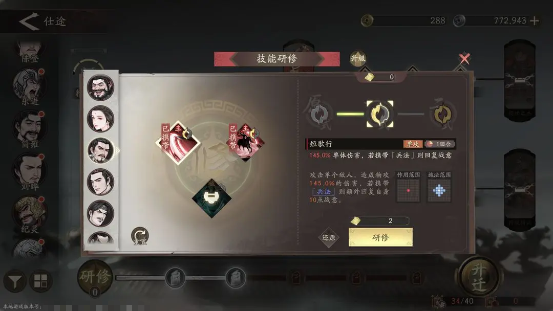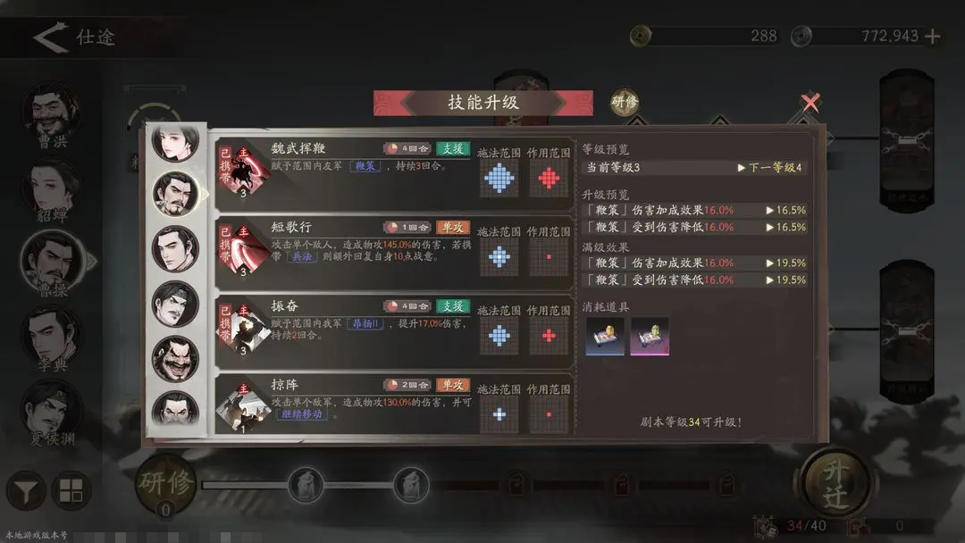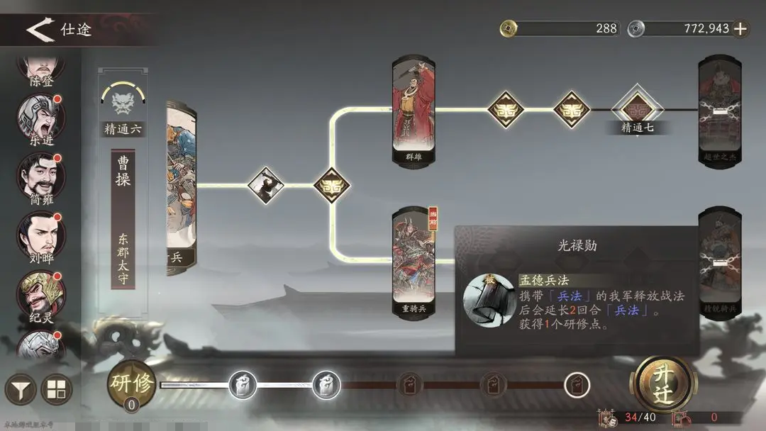要完全激活曹操的核心能力,需同步推进两条仕途路线:群雄线解锁关键增益技能,重骑兵线则赋予其光环特性。“短歌行”为其自带计策,可对敌方造成伤害,进阶后额外附加战意回复效果;“振奋”为轻骑兵线起始技能,可在范围内赋予友军“昂扬”状态,使所有伤害提升17%。