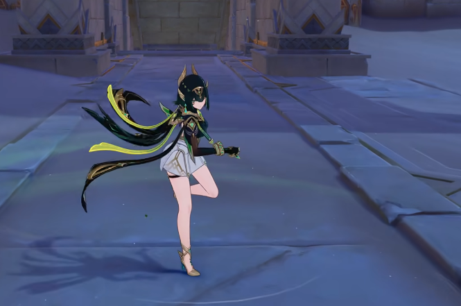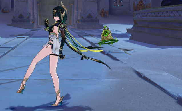 自空中发动下落攻击时,奈芙尔能够凝聚草元素力量,对地面目标施加范围性草元素伤害,适用于精准打击聚集的敌人或通过调整空中落点达成战术压制。除基础攻击外,她还拥有强大的元素战技——施放后可向前方快速突进,并在终点释放大范围草元素能量,形成区域伤害覆盖。突进完成后,角色将进入“影舞”状态,该状态下可通过进一步消耗体力强化后续动作效果,提升连贯作战能力。