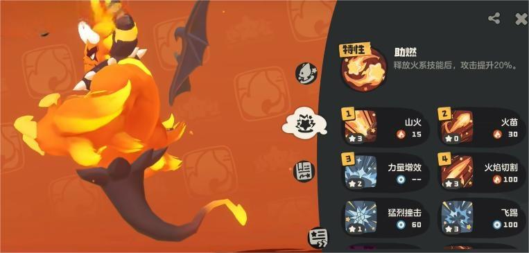 推荐携带山火、火苗、力量增益与火焰切割四项技能。其中,火苗技能能够快速叠加山火的威力层数,而力量增益不仅能提升自身攻击等级,还能进一步增强山火的实际伤害效果。当增益层数叠满后,山火将触发必杀机制,造成远超普通技能数倍的爆发性伤害,足以瞬间秒杀高血量目标。