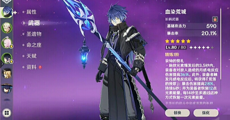 专武“血染荒城”是最佳选择,完美契合其高频爆发特性;其他可用长柄武器包括赤沙之杖、支离轮光等,均能提供良好增益。若暂无五星武器,也可通过西风大剑、锻造类武器如万能钥匙或拾慧铸熔进行前期过渡,确保基本作战能力。