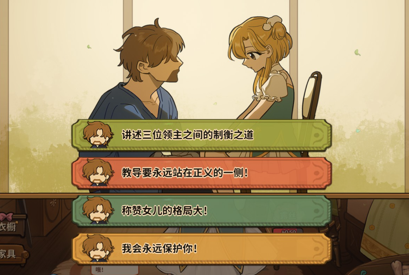 占卜师相关情节中,若选择“教她保护自己”,将提升博学属性,持续推动智力成长方向。关于属性影响机制:当女儿年满12岁后,选择“永远保护”选项可提升爱值,更高的爱值会解锁更多温馨的家庭互动剧情;而“勇往直前”的抉择则强化勇敢属性,让她在面对突发状况时更倾向于采取积极果断的应对方式。