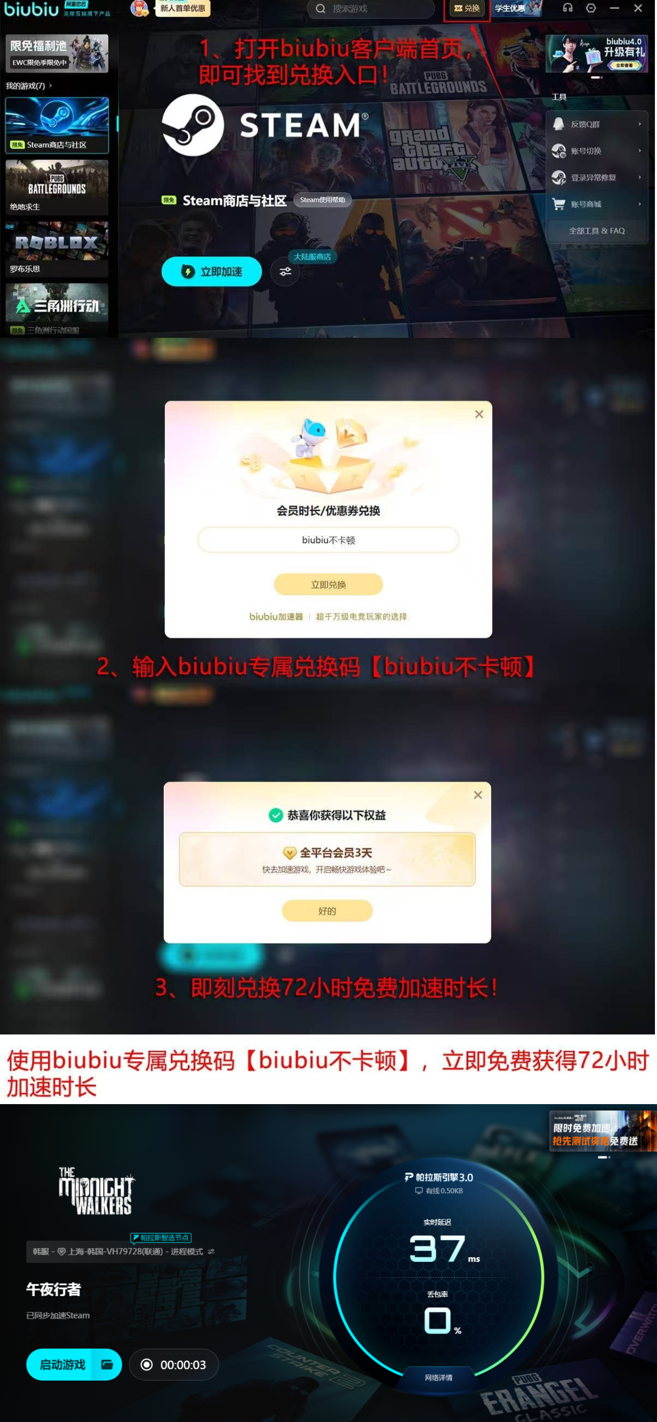 当前平台还推出多项体验福利:新用户注册即可自动获取24小时免费提速服务,无需手动操作兑换;同时,所有玩家都能额外领取三天体验时长,只需在指定位置输入口令【biubiu不卡顿】就能完成领取,不限制使用时间,灵活安排游戏时间。